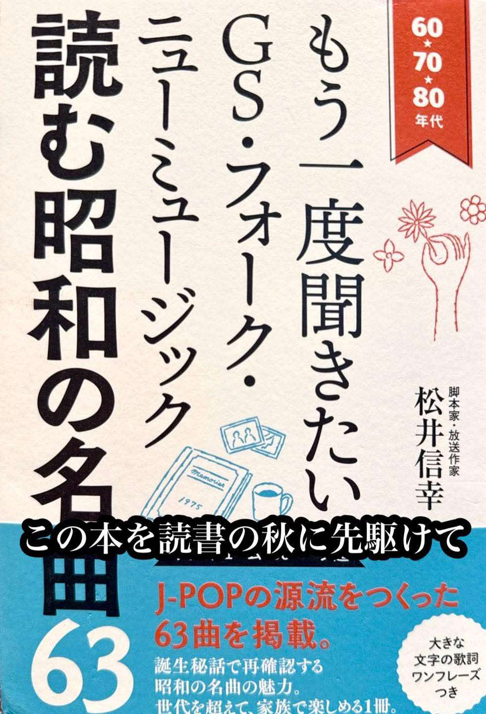 俳句フォトエッセイ2025.10.03この本を読書の秋に先駆けて小山正見この本とは、『もう一度聞きたいGS・フォーク・ニューミュージック 読む昭和の曲63』である。著者は放送作家で脚本家の松井信幸さんである。何を隠そう。松井さんは、ぼくの主宰する俳句フォトの会の有力メンバーである。ページをめくって、驚いた。まるでぼくの青春が詰まっているようなのだ。表紙に60★70★80年代とある。勿論これは1960年代〜の事だが、一瞬60代70代80代の人にピッタリだと書いているように見えてしまった。(笑)懐かしい曲ばかりである。各編の最初のページに歌詞のワンフレーズが大きなポイントで載っている。「ああ!この歌」というのもあるし、「こんな詞だったのか」と、意外に感じるものもある。この本の特徴は、一つ一つの曲に詳細なエッセイが軽妙な筆遣いで添えられている事だ。業界の中に身を置き、実際に見聞きした人でしか知り得ない事実が満載である。ぼくの好きな作家に小林信彦がいるが、彼の本を彷彿とさせる。例えば、沢田研二のタイガースだ。もとは「ファニーズ」という名前だったが、作曲家のすぎやまこういちに「良い名前を」と頼んだところ、「関西出身なら、タイガースがいいんじゃない」ちょうどその頃動物の名前をつけるのが流行っていたらしいが(笑)小椋佳のデビュー秘話も興味があった。神田川と南こうせつの逸話も。この本には歌謡曲はない。しかし、どうやら姉妹編で『昭和歌謡ものがたり』があることがわかった。これも読みたい。早速、ネットで注文した。正に「歌は時代と共に、人生と共に」だと感じた一冊だった。アルソス発行『読む昭和の名曲63』本体2000円+税https://amzn.to/42GOL5E