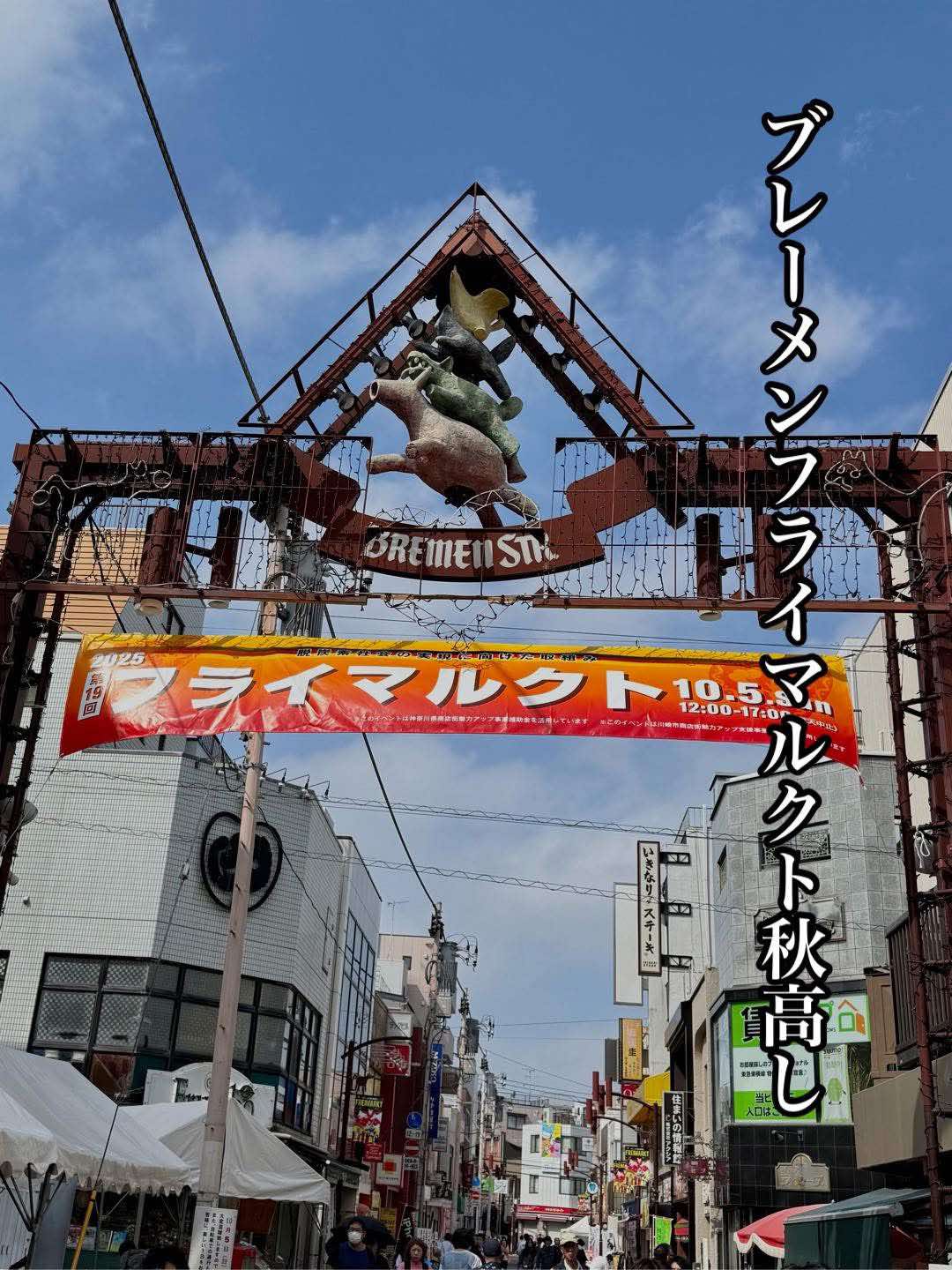 俳句フォトエッセイ2025.10.26ブレーメンフライマルクト秋高し小山正見東急線元住吉の駅前である。西口のこの通りをブレーメン通りと言う。ぼくが子供の頃は元住吉西口商店街と言っていた。いつの間にかこの通りが「ブレーメン通り」となり、駅前にはブレーメンの音楽隊の像が建てられてた。名前が変わったのは1980年代の後半らしい。丁度バブルの全盛期である。全国各地でスーパーマーケットが力を増し、駅前の個店は窮地に立たされてつつあった。この危機を救おうと市と協力してモール化する構想が生まれた。商店街の道を石畳にし、街灯などもヨーロッパ調に統一。名前も色々探し「ブレーメン商店街」に決めたらしい。この通りに今はバスは通っていない。12時を過ぎると車も進入禁止だ。そのおかげもあって、今も商店街は大賑わいである。この商店街の一年一度のお祭りが「フライマルクト」である。元々は、ドイツのブレーメン市のお祭の名前だ。いつもでも混んでいるブレーメン通りだが、この日は更に通り抜けるのが困難なほど人で溢れる。この賑わいは「この町に暮らしてよかった」と言う満足感を与えてくれる。こんな様子だから、全国各地からの視察も引きも切らない。この商店街を率いてきたのが理事長の伊藤博さんである。丁度一年程前、ぼくは伊藤さんを「小山正見のかわさき俳句フォト」で取材した事がある。そして、この街にこの人ありて豊の秋と詠んだ。この伊藤さんが先日叙勲を受け、秋の園遊会に招待された。当然かも知れないが誠にめでたい。正に我が街の誇りである。その伊藤さんに昨日の朝会った。手にトングを持ち、商店街を掃除されていた。頭が下がる。ぼくは、「おめでとうございます。」と声をかけ、握手していただいた。すると「小山さんも街にとって大切な人だから・・・」と思いもかけない言葉をいただいた。ありがたい限りである。