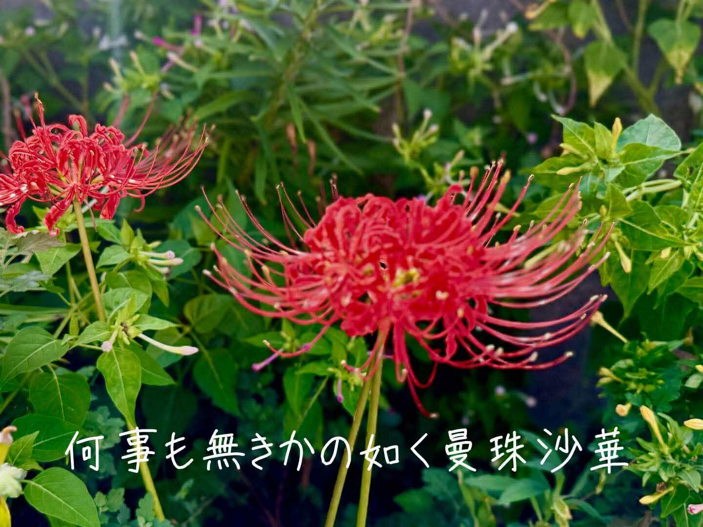 俳句フォトエッセイ2025.10.09何事も無きかの如く曼珠沙華小山正見今年も曼珠沙華が咲いた。しかし、例年より遅い。曼珠沙華は別名彼岸花と呼ばれる。お彼岸の時期に丁度花盛りになるからだろう。「十日の菊」ではないが、お彼岸に間に合わない彼岸花は少々魔が抜けているように思う。しかし、曼珠沙華の方はそんなことお構いなしだ。秋空に赤い花を輝かせている。突き抜けて天上の紺曼珠沙華 山口誓子を知ったのは俳句を学び始めてすぐの頃だ。実に巧みな描写だ。紺に対比される曼珠沙華の赤が鮮やかに浮かびあがる。(書いてないのに!)歯切れが良く格調がある。すっかり気に入った。森澄雄の西国の畦曼珠沙華曼珠沙華も好きだ。にも関わらず、ぼくは曼珠沙華という花を好きになれない。なんとなく不気味だからだ。赤の色さえ不吉に思えてしまう。死人花という別名の方がピントくるほどだ。赤白を揃へて妖し曼珠沙華 正見と詠んだこともある。そんなわけで各地にある曼珠沙華の観光名所には行く気になれない。それでも曼珠沙華に関してすごく好きなこともある。山口百恵が歌った「曼珠沙華」である。こう書いて「まんじゅしゃか」と読ませる。この読み方はサンスクリット語だそうだ。作曲は宇崎竜童、作詞は阿木燿子である。ぼくはこの歌を門倉有希のカバーで何百回となく聴いた。涙にならない悲しみがある事を 知ったのは ついこの頃の歌詞で始まる失恋の歌だ。門倉有希は昨年6月に50歳で他界した。自称ファンだったぼくにとっては曼珠沙華は、さしずめ門倉有希を哀悼する花である。