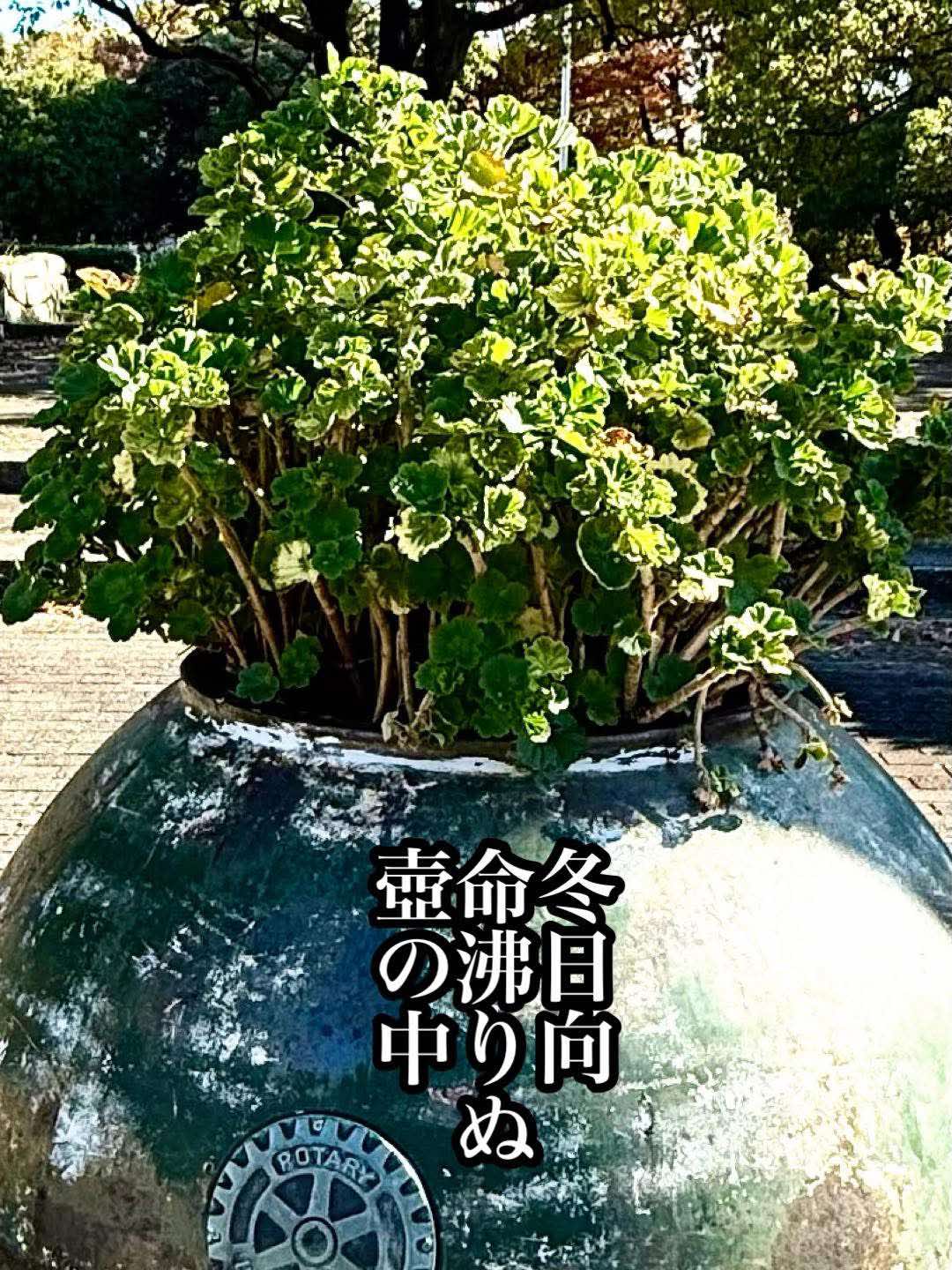 俳句フォトエッセイ2025.12.21冬日向命沸(たぎ)りぬ壺の中小山正見コロナの最中に、この壺に植えられた姫女苑を見て、生きるとは密になること姫女苑 正見と詠んだことは、前に述べた。この壺の写真を見ると、更に密だ。命が沸っているかに見える。この植物は、ゼラニウムだろう。一年中花をつけることもあるそうだ。壺の裏側に回ったら、二輪ほど花が開いていた。ゼラニウムは、公園や学校の花壇など、至る所に見ることができる。それは、暑さにも寒さにも強く、日当たりさえ良ければ手入れもほとんど要らないからだ。咲く時期が長く、手入れがいらないとなれば、公園の花壇などに植えるにはうってつけだ。更にゼラニウムは、挿木(挿芽)でも簡単に増やすことができるので経済的でもある。ゼラニウムは、オランダ経由で江戸時代の終わりに日本に入ってきたが、元々は南アフリカが原産地らしい。コロンブス以降、世界がグローバルになるにつれて人間だけでなく、植物も世界中に広がったということだろう。日本に入ってきた当時、ゼラニウムは「天竺葵」と呼ばれた。明治初年の植物書『本草通串』(こんな本があるんだ!)には、「天竺葵 西洋ヨリ来ル花ナリ 葉香気アリ、鉢植スベシ」との記述があるそうだ。我が家の鉢にも一年中花や緑を絶やさないにしたいので、このゼラニウムも有力な候補かもしれない。