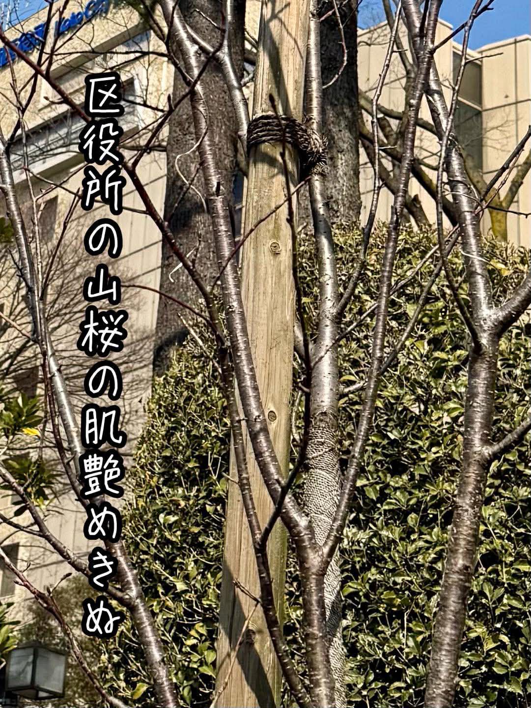 俳句フォトエッセイ2026.03.12区役所の山桜の肌艶めきぬ小山正見区役所の前庭に山桜が三本ある。植えたのはおよそ十年前だ。前庭に植えることで、俳句教育を区に根付かせたいと思った。幹は確実に太くなっている。趣旨を謳い寄付を募ったところ、約30万円が集まった。多くの人が応援してくれて植樹となった。植樹式では区長から挨拶をいただき、富岡八幡宮の宮司丸山総一氏にお祓いをしていただいた。俳人の長谷川櫂氏による講演も行われた。植樹された山桜の前には俳句教育の推進を願って、芭蕉の「さまざまなこと思ひ出す桜かな」のプレートが置かれている。ぼくは3年前に江東区の「俳句教育推進員」の職を辞したが、現在もS先生を中心に江東区の俳句教育はますます発展している。ぼく自身は、時々ピンチヒッターで江東区の学校で授業する。先生方の研修会だけはぼくの担当である。この日も区役所の近くの学校で俳句の研修会を行なった。この研修会で、一番強調したかったのは、こどもたちのやる気を引き出す指導の大切さについてだった。俳句の授業は子どものやる気がなければ成り立たない。「中七ができれば俳句ができる」とハードルを下げることもそうだが、子どもと目を合わせて話すことや子どもたちの間を歩き回り、出来具合を認め、励ますことなども大切である。授業を成立させる上で、教師の最大の武器は自分の目と自分の体であることを伝えたかった。それこそが子どものやる気と緊張感を作る源なのだ。研修会は楽しく進行した。先生方のリラックスした笑いが起きた。「俳句は難しくない」ということは伝わったようだ。とりあえずよしとしよう。山桜の芽もそろそろ出始めるだろう。