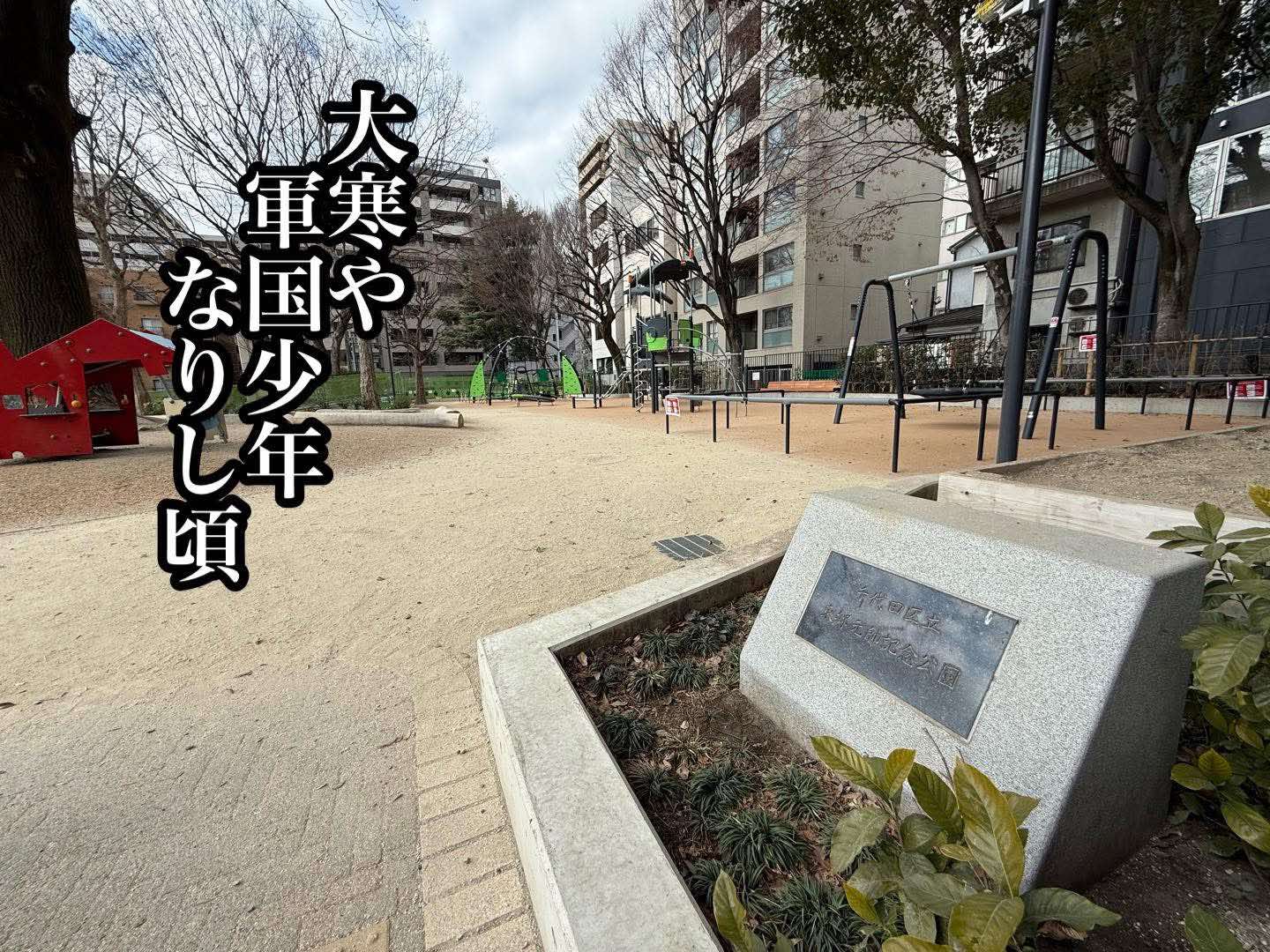 俳句フォトエッセイ2026.02.05大寒や軍国少年なりし頃小山正見ここは千代田区の東郷元帥公園である。東郷元帥とは、連合艦隊を率い、あの日本海海戦でロシアのバルチック艦隊を撃破した、東郷平八郎のことだ。子供だったぼくにとって、東郷元帥は乃木希典大将と並んで英雄だった。わざわざ横須賀まで戦艦三笠を見に行ったこともある。「水師営の会見」という軍歌は何度聞いたか分からないほどだ。「旅順開城約なりて 敵の将軍ステッセル」から始まる歌だ。佐々木信綱の作詞で、最後は「昨日の敵は今日の友 語る言葉も打ち解けて 我は讃えつつ彼の防御 彼はたたえつ我が武勇」で終わる。映画も観た。「明治天皇と日露大戦争」。特に好きだったのは軍艦だった。太平洋戦争当時の戦艦や航空母艦などの名前、その性能などはほぼ頭の中に入っていた。マニアと言っても良いほどだ。軍艦のプラモデルも作った。丁寧にペイントまでした。そのいくつかはまだ我が家にある。親にねだって日の丸を買ってもらって祝日に玄関に飾ってもらった。「敵中横断三百里」などの軍記物を胸躍らせて読んだ。戦争の悲惨さも何も知らない頃だった。四季派の詩人であった父・正孝は戦争に関わる詩をただ一編だけ残している。見 学 小山正孝私たちは 二列になつて晩秋の 午前の光をあびて 立つてゐた兵たちは 銃を据ゑつけ 照準をつけた山麓は みどりにまじつて 黄葉してゐ たしづかで 誰も居ない 原に赤い 二本の 小さい旗が ひらひらしてゐたうち出した音が はつきり 十も つづいて二つの曳光弾が 飛んで行つた「命中」「よし」兵たちは 目標を かへたまた 銀色の弾は すうつと 糸ひいてのびて行つた私たちは 思つた戦争ではかういふやつが 向ふからも来るんだ赤い旗は 野の花のやうだったこの詩は詩集には収録されていない。