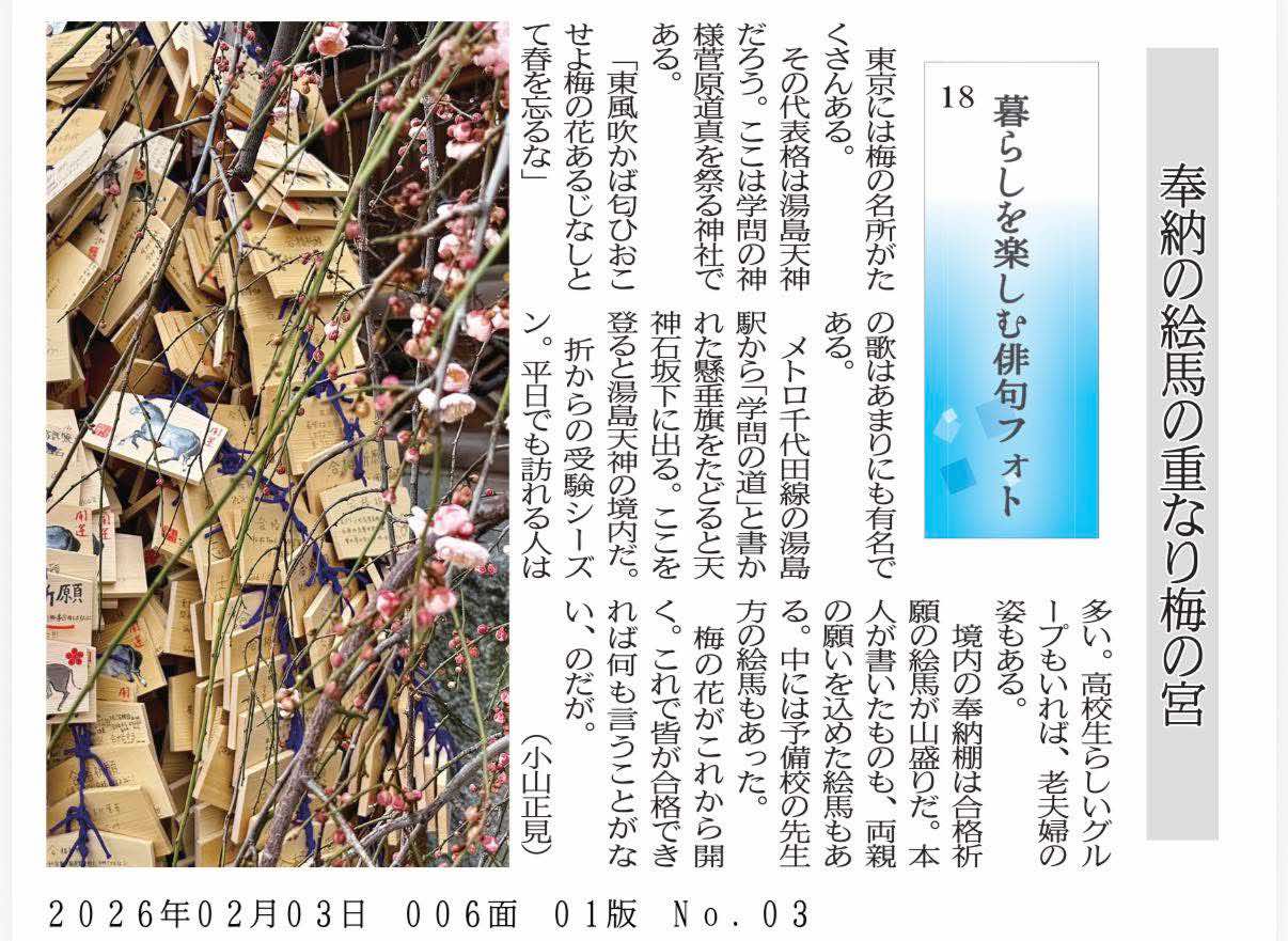 俳句フォトエッセイ2026.02.16奉納の絵馬の重なり梅の宮小山正見東京には梅の名所がたくさんある。しかし、その代表格は湯島天神だろう。ここは学問の神様菅原道真を祀る神社である。「東風吹かば匂ひおこせよ梅の花あるじなしとて春を忘るな」の歌はあまりにも有名である。メトロ千代田線の湯島駅から「学問の道」と書かれた懸垂旗を辿ると天神石坂下に出る。ここを登ると湯島天神の境内だ。折からの受験シーズン。平日でも訪れる人は多い。高校生らしいグループもいれば、老夫婦の姿もある。境内の奉納棚は合格祈願の絵馬が山盛りだ。本人が書いたものも、両親の願いを込めた絵馬もある。中には予備校の先生方の絵馬もあった。梅の花がこれから開く。これでみなが合格できれば何も言うことがないのだが。都政新報2/3付の「暮らしを楽しむ俳句フォト」18です。