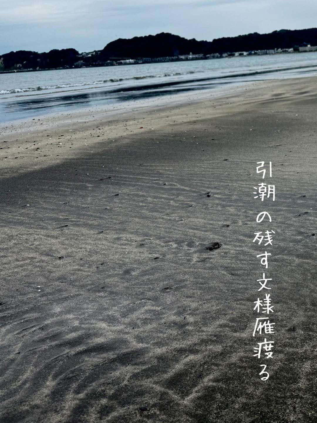 俳句フォトエッセイ2025.11.12引潮の残す文様雁渡る小山正見恒例の鎌倉吟行である。鎌倉の知られざる名所を毎回案内してくださる。それに甘えて、出来るだけ参加するようにしている。江東区を退職してからだから、3年目だろうか。先月は元八幡に行った。今月は材木座海岸である。この材木座の名称は和賀江島に船着場が出来、材木などの集積地になったことによるらしい。今でも和賀江島の船着場の跡が残っている。遠浅の海で、海水浴には最適である。ぼくは、この材木座海岸で泳いだ記憶がある。正確に言えば、すぐ近くにあるお寺、光明寺に泊まった事があるのだ。もしかしたら、寺そのものでなく民宿だっのかもしれない。なんとなく高校時代の親友のNが一緒だったような気がして、メールで聞いてみたら。やはり、そうだった。N家は毎年、材木座に出かけ、光明寺の宿坊に泊まっていたという。すると、そこにぼくが便乗したということになる。なぜ覚えているかと言うと、目の前に突然現れた女の子のせいだ。その笑顔の輝きが一瞬でぼくの脳裏にこびりついてしまった。もちろん、その後の交流が一切あるわけではないが、材木座というと今でもその女の子のことを思い出すのだ。この日の吟行の目的のもう一つは、材木座近くにある鎌倉十井の一つ、六角の井を見ることだった。しかし、そこに行って見ると、井戸は無惨にもビニールシートでぐるぐる巻きにされていて、碑だけが寂しく立っていた。そこを過ぎると逗子漁港はすぐそこだった。こんなに近いのかと不思議な気がした。句会は10句出しの8句選というやり方だ。一票でも入った句は議論の俎上にあげられる。午後2時の締切までに慌てて句を整理する。幼子の駆け出してゆく浜の秋捨て置かる錨の錆の秋思かななど6句には点が入ったが、4句は無点だった。写真の句はそんな無点の句の一つである。