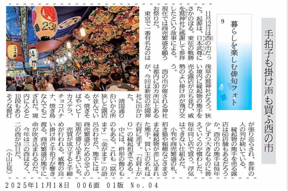 俳句フォトエッセイ2025.12.07手拍子も掛け声も買ふ酉の市小山正見 11月12日は酉の市だった。起源は、日本武尊(やまとたける)に遡る。東征の戦勝を鷲神社に感謝して参拝したという故事による。現在では商売繁盛を願うお祭りだ。 東京で一番有名なのは、浅草の鷲神社だろう。狭い境内に縁起物の熊手を売る露店が立ち並び、威勢のよい掛け声が飛び交う。 酉の市が催される神社は都内に三十ヶ所以上あるが、今回は新宿の花園神社に出かけた。 靖国通り沿いから所狭しと露店が並んでいる。焼きそばやベビーカステラ、チョコバナ、焼き鳥なんでもござれだ。境内に入ると十段もありそうな提灯が張り巡らされ、参拝の人の列が続いている。 縁起物の熊手を売る露店は60店舗もあるだろうか。それぞれの店に番号が付けられている。酉の市の熊手は毎年少しずつ大きなものに替えていくのが慣わしだ。毎年同じ店で買う。浮気はできない仕組みだ。 小判や商売繁盛の札、招き猫や稲穂などさまざまな縁起物が差し込まれた熊手。買主の名札は右肩にさす。「右肩上がり」の縁起担ぎである。 中には、枡形の飾りものもある。これも「富がます」「金がます」の語呂合わせだ。熊手には、商売繁盛の為の全ての知恵が盛り込まれている。 売買が成立すると手締めが行われる。威勢の良い掛け声と手拍子が響き渡る。商売繁盛の熊手に命が吹き込まれるのだ。 今年の二の酉は24日だ。!