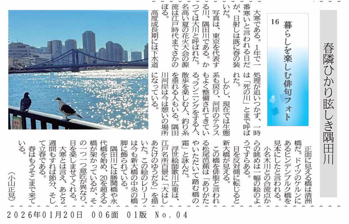 俳句フォトエッセイ2026.02.03春隣ひかり眩しき隅田川小山正見大寒である。一年で一番寒いと言われる日だが、陽射しは既に春の装いだ。写真は、東京を代表する川、隅田川。かつては大川と呼ばれた。夏の花火大会の源流は江戸時代まで遡ることができる。高度成長期には、下水道処理が追いつかず、一時は「死の川」とまで呼ばれた。しかし、現在では生態系も戻り、河岸のテラスもよく整備されてきている。ランニングをする人、散歩を楽しむ人、釣糸を垂れる人もいる。隅田川河岸は憩いの場所になっている。正面に見える橋は清洲橋だが、ドイツのケルンにあるヒンデンブルク橋を見本にしたと言われる。小名木川との合流点からの眺めは一幅の絵のようだ。目を反対側に転じれば新大橋が見える。この橋を俳聖と言われる松尾芭蕉は「ありがたやいただいて踏む橋の霜 」と詠んだ浮世絵師歌川広重は、江戸名所百景に「大はしあたけのゆうだち」を描いた。この有名な絵のレリーフは今も新大橋の中央の橋脚に飾られている。隅田川には勝鬨橋や永代橋を始め、20を超える橋が掛かっているが、その一つ一つ意匠が異なり、目を楽しませてくれる。大寒とは言え、あと2週間もすれば節分そして立春である。春はもうそこまで来ている。都政新報1/20付「暮らしを楽しむ俳句フォト」