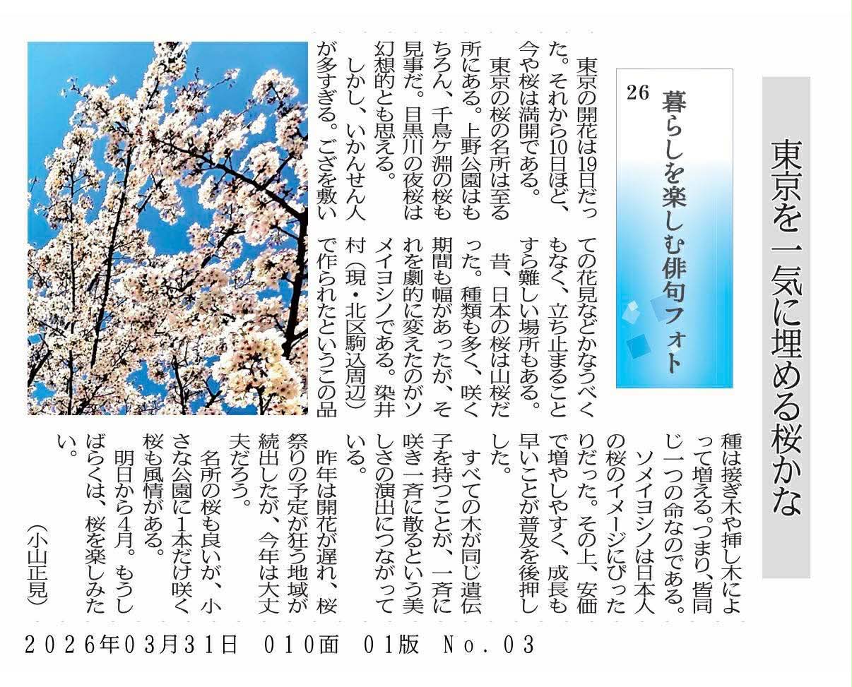 俳句フォトエッセイ2026.04.17東京を一気に埋める桜かな小山正見東京の開花は3月19日だった。それから10日ほど、今や桜は満開である。東京の桜の名所は至る所にある。上野公園はもちろん、千鳥ヶ淵の桜も見事だ。目黒川の夜桜は幻想的とも思える。しかし、いかんせん人が多すぎる。ござを敷いての花見など叶うべくもなく、立ち止まることすら難しい場所もあ。昔、日本の桜は山桜だった。種類も多く、咲く期間も幅があったが、それを劇的に変えたのがソメイヨシノである。染井村(現北区駒込周辺)で作られたというこの品種は接ぎ木や挿し木によって増える。つまり、皆同じ一つの命なのである。ソメイヨシノは日本人の桜のイメージにぴったりだった。その上、安価で増やしやすく、成長も早いことが普及を後押しした。すべての木が同じ遺伝子を持つことが、一斉に咲き一斉に散るという美しさの演出に繋がっている。昨年は開花が遅れ、桜祭りの予定が狂う地域が続出したが、今年は大丈夫だろう。名所の桜も良いが、小さな公園に一本だけ咲く桜も風情がある。明日から4月。もうしばらくは、桜を楽しみたい。都政新報3/31付 「暮らしを楽しむ俳句フォト」26