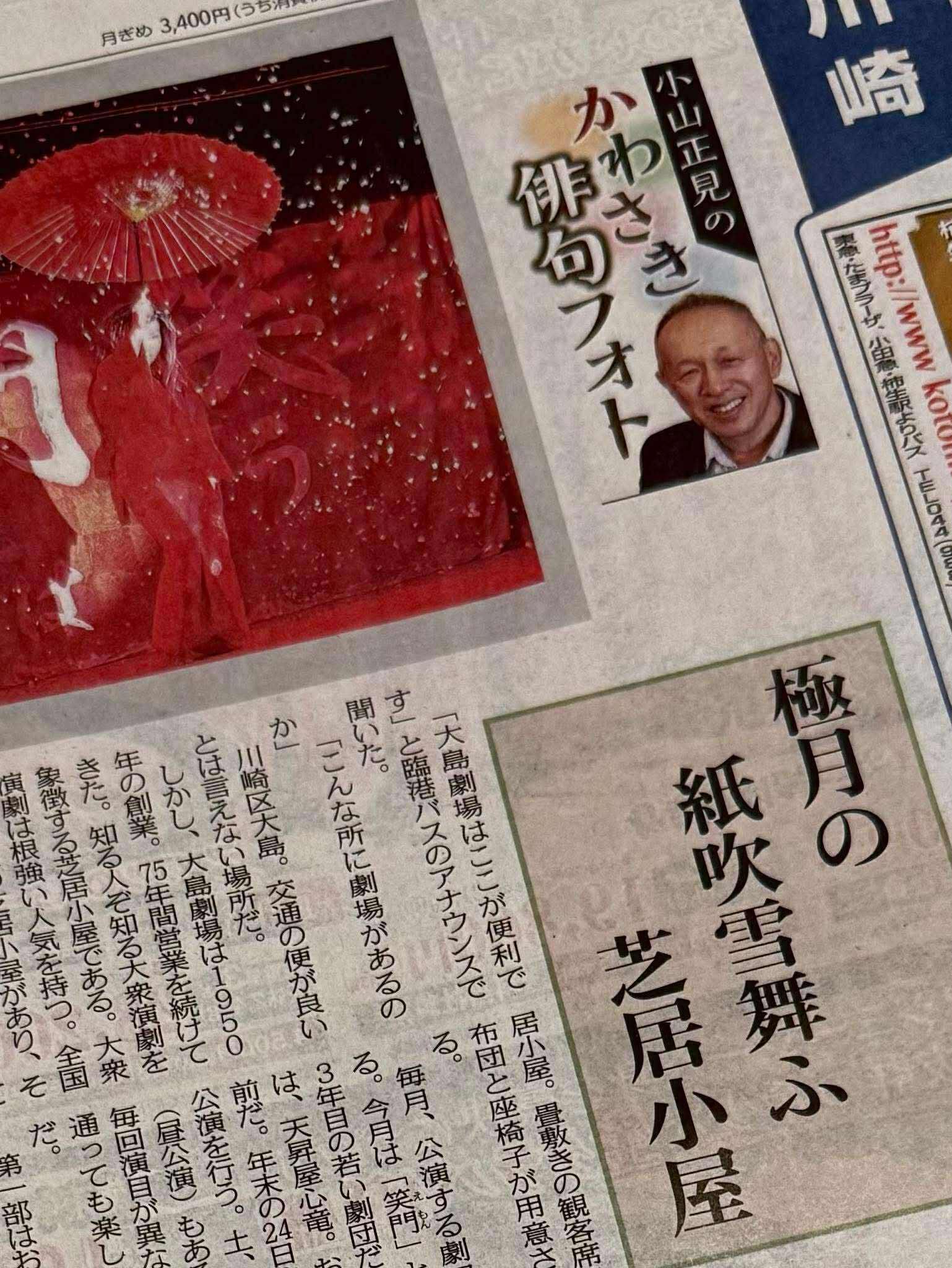 俳句フォトエッセイ2025.12.31極月の紙吹雪舞ふ芝居小屋小山正見「大島劇場はここが便利です」と臨港バスのアナウンスで聞いた。「こんな所に劇場があるのか」川崎区大島。交通の便が良いとは言えない場所だ。しかし、大島劇場は1950年の創業。75年間営業を続けてきた。知る人ぞ知る大衆演劇を象徴する芝居小屋である。大衆演劇は根強い人気をもつ。全国に50以上の芝居小屋があり、それを上回る数の劇団が活動している。如何にも昭和レトロの芝居小屋。畳敷の観客席には座布団と座椅子が用意されている。毎月、公演する劇団は変わるが、今月は「笑門(えもん)」という結成3年目の若い劇団だった。座長は、天昇屋心竜。実に格好良い名前だ。年末の24日まで休みなく公演を行う。土、日にはマチネの公演もある。驚いたのは毎回演目が異なることだ。毎日通っても楽しめる仕掛けになっている。第一部はお芝居。この日の演目は「天保水滸伝」だった。すぐ目の前で繰り広げられる丁々発止の芝居に思わず引き込まれる。役者の見えがこれほど格好良いとは思わなかった。ファンができるのは当然だ。「推し」の原点はここにあるのかもしれない。第二部は舞踊ショーである。演歌や歌謡曲に合わせて一人一人の役者が踊る。女形舞踊である。この女形がとてつもなく美しい。映画「国宝」で吉沢亮の演技が話題になったが、どの役者も引けを取らない。手の届きそうなところで、美しさと色気がはじける。黄色い声が飛び、贔屓の役者には花やレイの「おひねり」を帯に挟む。ぼくの手を取ってくれた女形は男だとわかってもドキドキしてしまった。観客が多くても少なくても手を抜かない。こんな美しく真に迫った演技が3時間も目の前で見られて、二千円だ。帰りは寒さが気にならなかった。何だか癖になりそうである。