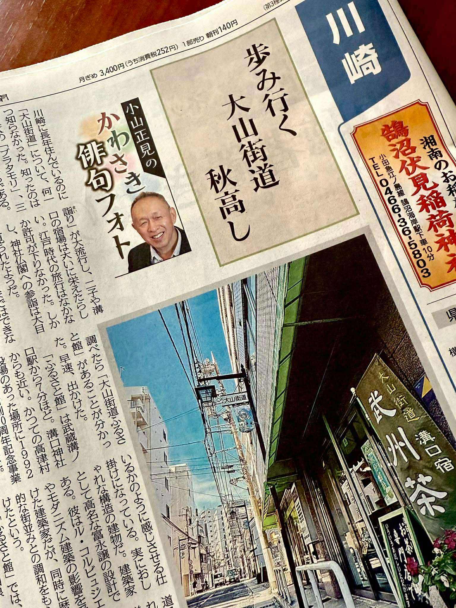 俳句フォトエッセイ2025.10.28歩み行く 大山街道 秋高し小山正見 川崎に長年住んでいるのに「大山街道」について、何一つ知らなかった。知ったのはNHKの「ブラタモリ」、三軒茶屋編を見たからである。 大山街道は東京・赤坂から神奈川県伊勢原市の大山を結ぶ。全長は約70キロ。大山は標高1252メートル。雨降山ともいわれ、大山阿夫利神社(おおやまあふりじんじゃ)のある信仰の山だ。 江戸時代の中期には「大山詣(まい)り」が大流行し、二子や溝口の宿場は大いに栄えたらしい。江戸時代の旅行はなかなか許可が下りなかった。しかし、神社仏閣への参詣は大目に見られたようだ。 「お伊勢参りまではできないが、大山ぐらいまでなら」といったところだろう。帰路は江の島や鎌倉で遊んで帰ったというから、お上の目をうまくかいくぐったものだ。 調べたら「大山街道ふるさと館」があることが分かった。早速、出かけた。 「ふるさと館」は武蔵溝ノ口駅から7分ほど。溝口神社からも近い。かつての高津村役場のあった場所に1992年、川崎市制70周年記念事業の一環として建設された。 内部には吹き抜けの空間を設け、あたかも街道を歩いているかのように感じさせる仕掛けになっている。実におしゃれな構造の建物だ。建築家として高名な富永譲の設計である。彼はル・コルビュジエやモダニズム建築の影響を受けた建築家だが、同時に歴史的な街並みとの調和をも心掛けたという。 「ふるさと館」では、10月26日まで「岡本和泉 大山街道スケッチ紀行」展が開催されている。現在の大山街道の様子が実によく分かる。街道沿いには、昔からの商家がいくつか残っている。中には何代も続いているお茶屋さんもあった。 江戸の後期の大山街道は駿河のお茶やさまざまな物資を江戸に運ぶ重要な輸送路でもあったのだ。<おやま・まさみ> 1948年川崎市生まれ。東京都江東区立八名川小学校長などを歴任。子どもたちが俳句に親しむための授業に取り組み、日本学校俳句研究会代表。「梓」俳句会同人、現代俳句協会会員。川崎市中原区でコミュニティースペース「感泣(かんきゅう)亭」を主宰。WEBサイト「みんなで楽しむ俳句フォト」でも情報を発信している。10/12付東京新聞川崎版「小山正見のかわさき俳句フォト」です。https://www.tokyo-np.co.jp/article/442075