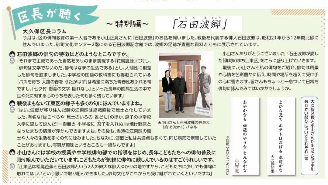 江東区報2月号(令和8年2月1日号)にて、「みんなで楽しむ俳句フォト」主宰の小山正見と、大久保ともか江東区長による対談が掲載されました。