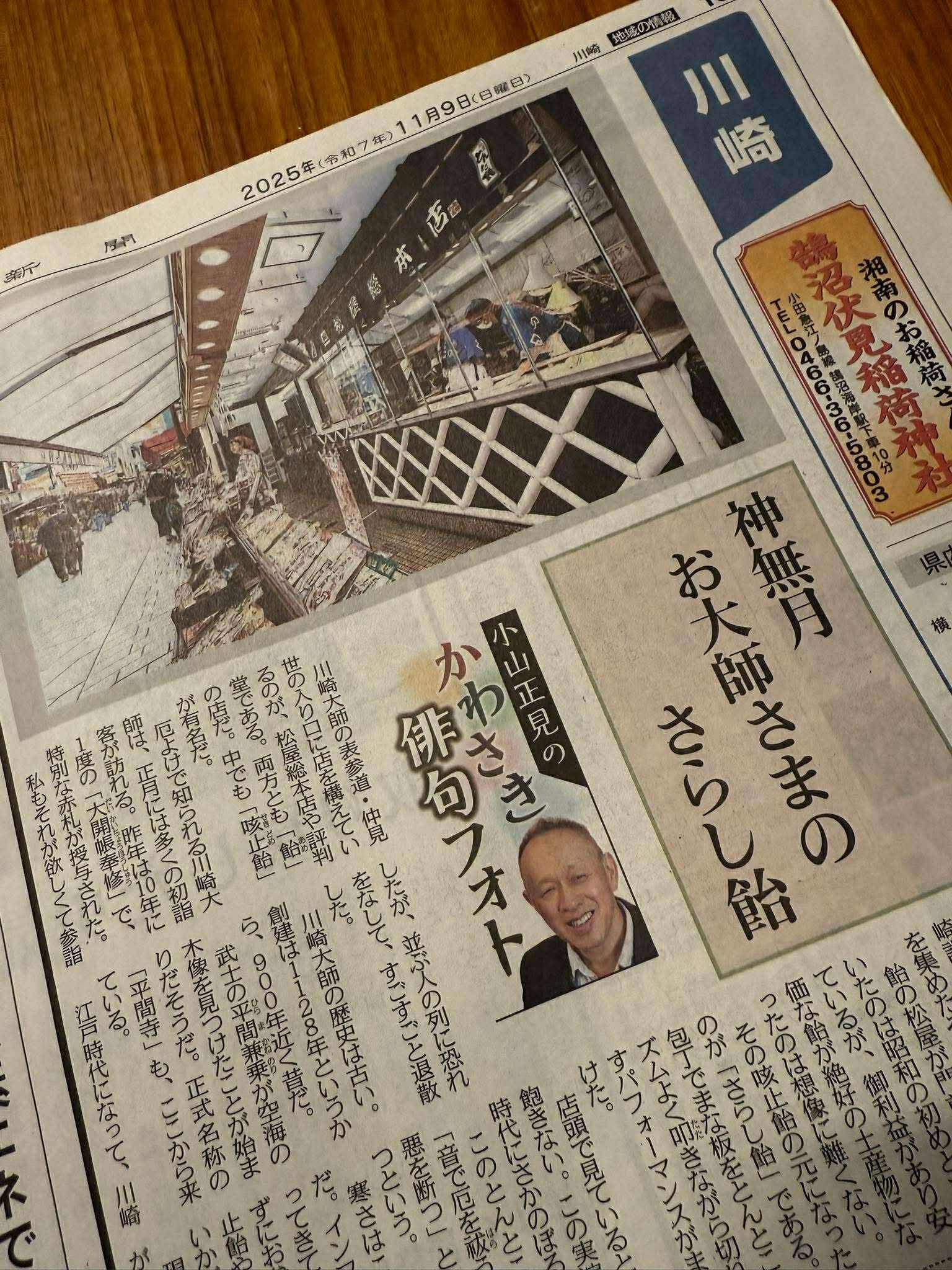 俳句フォトエッセイ2025.11.28神無月お大師さまのさらし飴小山正見 川崎大師の表参道・仲見世の入り口に店を構えているのが、松屋総本店や評判堂である。両方とも「飴(あめ)」の店だ。中でも「咳止(せきどめ)飴」が有名だ。 厄よけで知られる川崎大師は、正月には多くの初詣客が訪れる。昨年は10年に1度の「大開帳奉修(だいかいちょうほうしゅう)」で、特別な赤札が授与された。 私もそれが欲しくて参詣したが、並ぶ人の列に恐れをなして、すごすごと退散した。 川崎大師の歴史は古い。創建は1128年というから、900年近く昔だ。 武士の平間兼乗(ひらまかねのり)が空海の木像を見つけたことが始まりだそうだ。正式名称の「平間寺」も、ここから来ている。 江戸時代になって、川崎大師は大いに栄えた。「火難除(よ)け」「盗難除け」「病気平癒」に効くとされ、川崎詣では江戸の庶民の人気を集めたそうだ。 飴の松屋が門前に店を開いたのは昭和の初めとされているが、御利益があり安価な飴が絶好の土産物になったのは想像に難くない。 その咳止飴の元になったのが「さらし飴」である。包丁でまな板をとんとこリズムよく叩(たた)きながら切り出すパフォーマンスがまた受けた。 店頭で見ていると少しも飽きない。この実演は江戸時代にさかのぼるようだ。 このとんとこ叩く音は「音で厄を祓(はら)う」「包丁で悪を断つ」という意味を持つという。 寒さはこれからが本番だ。インフルエンザもはやってきている。正月を待たずにお参りし、帰りには咳止飴やさらし飴を求めたらいかがだろう。 現実的な御利益にもつながるかもしれない。東京新聞川崎阪「小山正見のかわさき俳句フォト」です。どうぞご覧ください。https://www.tokyo-np.co.jp/article/448010