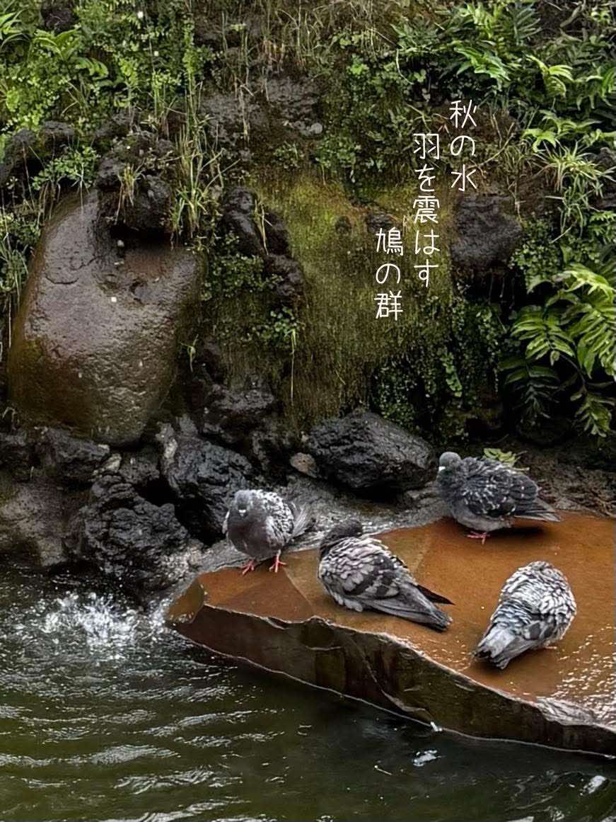 俳句フォトエッセイ2025.10.18秋の水羽を震はす鳩の群小山正見季語でいう「秋の水」とは、本来きれいで澄み切った水を指す。夏の間はプランクトンなどの微生物が繁殖して、水は濁っているが、秋になると水温が下がる。微生物の繁殖も下火になり、水が澄む。こうした現象を元にした言葉が「秋の水」という季語だ。「水の秋」とひっくり返せば、そうした美しい水をたたえる秋という意味になる。日本語の不思議は言葉に情緒が結びついていることだ。同じ風でも「春風」と言えば何となくうきうきする。逆に「秋風」と言うとほのかな寂しさとか悲しさが感じられる。俳句がたった十七音で詩になり得るのは、こうした日本語の特徴によるものかもしれない。鳩が羽を震わしているのは、実は水浴びをしているからだ。写真だけではわからないが、噴水の水が上から落ちてきているのだ。ぼくは鳩に親近感を持っている。子供の頃、家の庭に鳩舎を作り飼っていたからだ。今ならとても不可能だろうが、近くに大きな鳩舎があり、夕方になると数十羽が空を舞った。それが羨ましかったのだろう。電気屋さんからもらってきた家電の木枠に金網を張って、鳩小屋を作り上げた。トラップという名前の入口(外からは入れるが中からは外に出られない)を作り、見様見真似で鳩の訓練をした。鳩の餌にも凝った。とうもろこしを主体に小麦や麻の実、胡麻などを合わせて配合した。生き物を飼うことは糞を処理することだと身に沁みた。結局、全ての鳩を死なせてしまい、ぼくの鳩体験は終わりになった。鳩を見ると、コキコキと鳴る鳩の羽音と手に持った時の感触を思い出す。