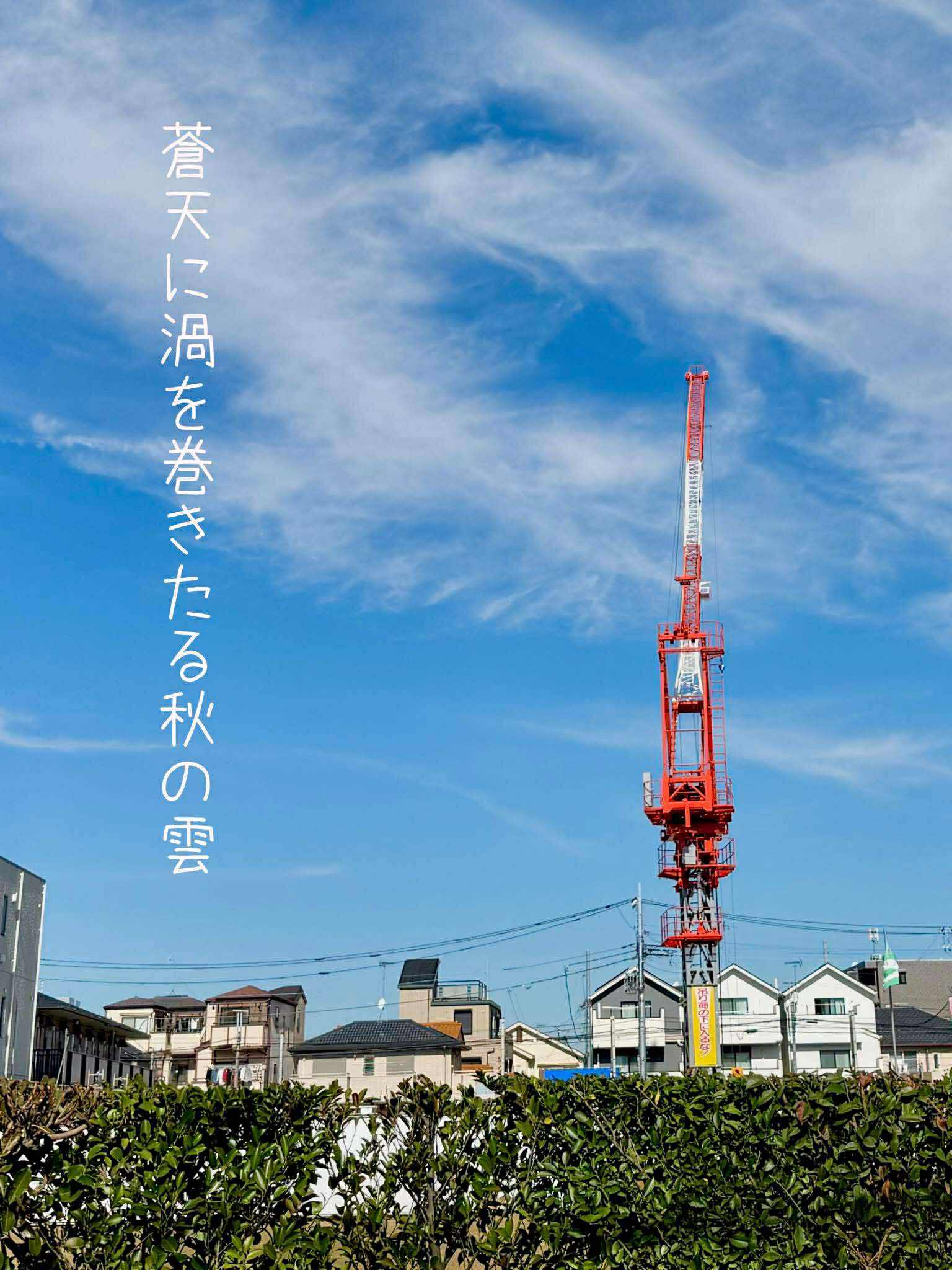俳句フォトエッセイ2025.11.22蒼天に渦を巻きたる秋の雲小山正見妻がお世話になっているグループホームの前である。既に4年が過ぎた。ぼくはこの土地を200回以上見続けてきたことになる。最初は畑でかなりの部分で作物が作られていた。昨年はキャベツが二畝植えられていたが、収穫されずに菜花の茎が伸び放題になっていた。その土地を半分売ったらしい。白い膜が張られ、工事が始まったようだ。住宅かマンションだ建つ気配が強い。大きなクレーンが入っているのを見ればマンションの公算の方が高いだろう。それにしても久しぶりの秋らしい空だ。湿度が下がったということだ。空の奥まで見通せるかのようだ。空に見える雲は、おそらく巻雲だろう。巻雲は5000mから10000mに出来る雲というから確かに高い。動かないように見えるが、上空は相当な風が吹き荒んでいるに違いない。秋の雲の代表格はなんと言っても「鰯雲」である。鯖雲とも鱗雲とも言われる。空一面がこの雲に覆われると、何となく不気味な感じがするものだ。「鰯雲」で最も有名な句は加藤楸邨の鰯雲人に告ぐべきことならずであろうが、ぼくは山口誓子の一生に幾たびか全面鰯雲の句に惹かれる。今年は既に冬の寒さだが、明日7日は暦の上でももう立冬である。