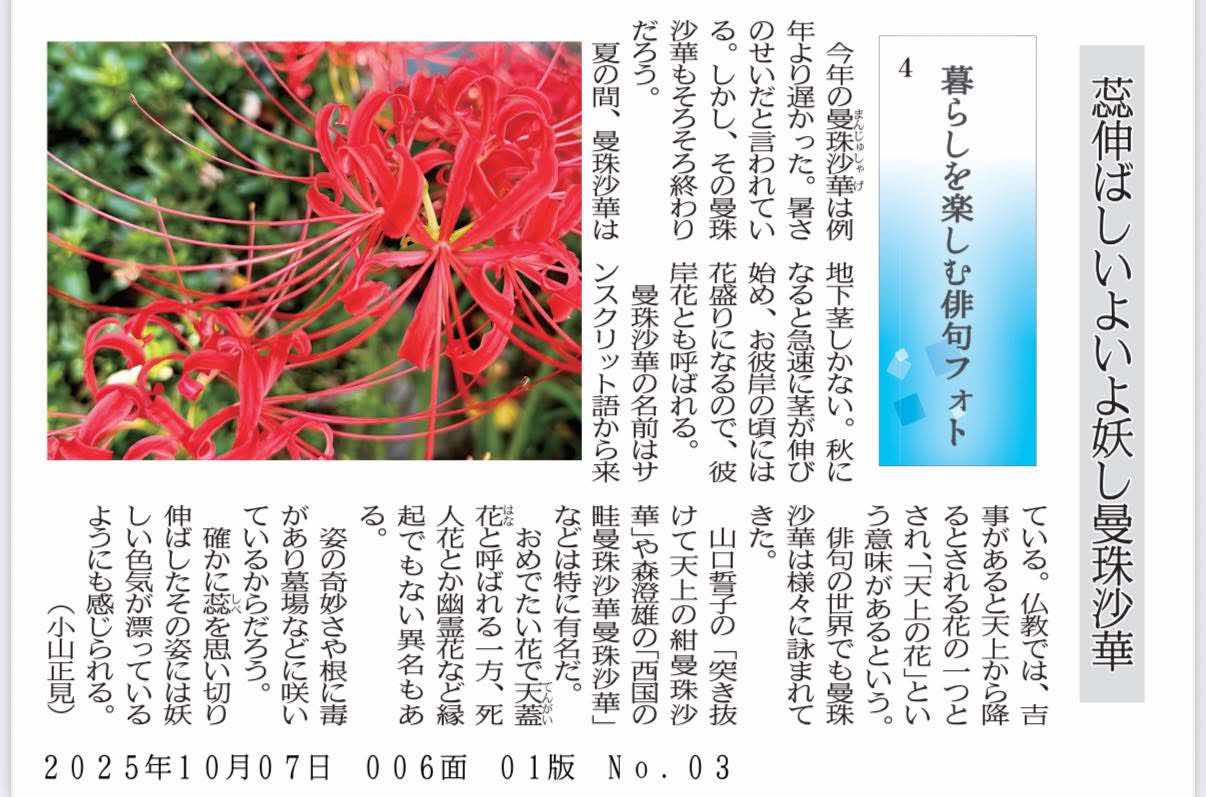 俳句フォトエッセイ2025.10.23蕊伸ばしいよいよ妖し曼珠沙華小山正見 今年の曼珠沙華は例年より遅かった。暑さのせいだと言われている。しかし、その曼珠沙華もそろそろ終わりだろう。 夏の間、曼珠沙華は地下茎しかない。秋になると急速に茎が伸び始め、お彼岸の頃には花盛りになるので、彼岸花とも呼ばれる。 曼珠沙華(まんじゅしゃげ)の名前はサンスクリット語から来ている。仏教では、吉事があると天上から降るとされる花の一つとされ、「天上の花」と言う意味があると言う。 俳句の世界でも曼珠沙華は様々に詠まれてきた。 山口誓子の「突き抜けて天上の紺曼珠沙華」や森澄雄の「西国の畦曼珠沙華曼珠沙華」などは特に有名だ。 おめでたい花で天蓋花と呼ばれる一方、死人花とか幽霊花など縁起でも無い異名もある。 姿の奇妙さや根に毒があり墓場などに咲いているからだろう。 確かに蕊を思い切り伸ばしたその姿には妖しい色気が漂っているようにも感じられる。都政新報10/7付 暮らしを楽しむ俳句フォト4