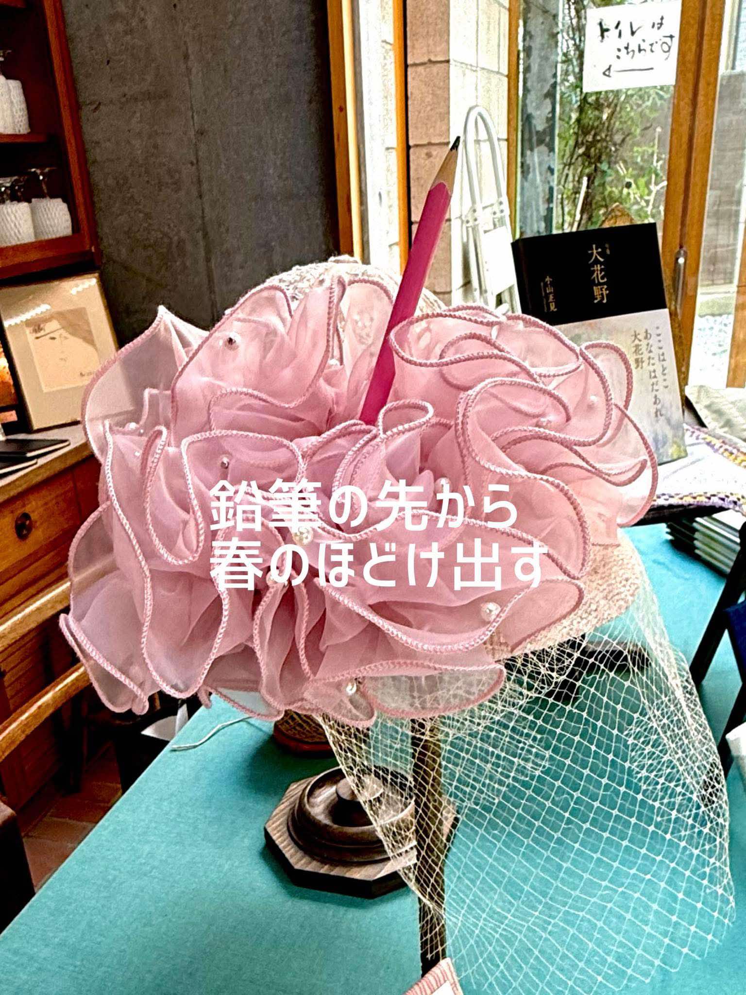 俳句フォトエッセイ2025.04.22鉛筆の先から春のほどけ出す小山正見今日から「大花野展」が元住吉の感泣亭で始まった。会期は4月13日(日)までである。「俳句から生まれた帽子」「帽子から生まれた俳句」小林愛さんと小山正見のコラボレーションである。「一点お洒落主義」のぼくの帽子は、すべて小林愛さんの手によるものだ。小林愛さんとの出会いは偶然だった。母が亡くなった年、妻と学芸大学に出かけた。昔からある「宮川」で鰻を食べるためだ。「宮川」は母と鰻を一緒に食べた思い出の店だ。ところがそこに「宮川」はなかった。がっかりして帰りかけたとき、近くの二階にお洒落な店を見つけた。古い木の階段を上って聞いた。「何の店ですか?」そこが帽子作家小林愛さんの工房兼スタジオViridianだった。ぼくは、いつの間にかViridianの常連になっていた。小林さんは、ぼくの句集『大花野』を読み、縁のある方々に紹介してくださった。俳句そのものにも興味をもたれ、その結果「帽子屋de俳句」というイベントが生まれた。「ドレスコードは帽子」というこのイベントは既に5回を重ねている。小林さんの帽子の作品にぼくが俳句をつけ、ぼくの俳句をモチーフに小林さんが帽子を作る。おそらく日本に一つしかない試みだろう。その集大成が今回の試み「大花野展」小林愛×小山正見である。帽子や小物で飾り付けられた感泣亭は、さながらお洒落なブティックのようである。小林さんの作業を見ていて「作家というものは完璧を目指すものなのだ」と強く思った。小物ひとつひとつまでおろそかにしない。作品の一つ一つに心が宿っているのだ。小林愛さんの帽子がますます好きになった。初日の今日は約20人の方が立ち寄ってくださった。中には、20年ぶりのKさん、30年ぶりのTさんの姿もあった。とても嬉しかった。会期は4月13日(日)までである。できるなら、ぜひ時間を作って訪れていただけるとありがたい。お待ちしています。