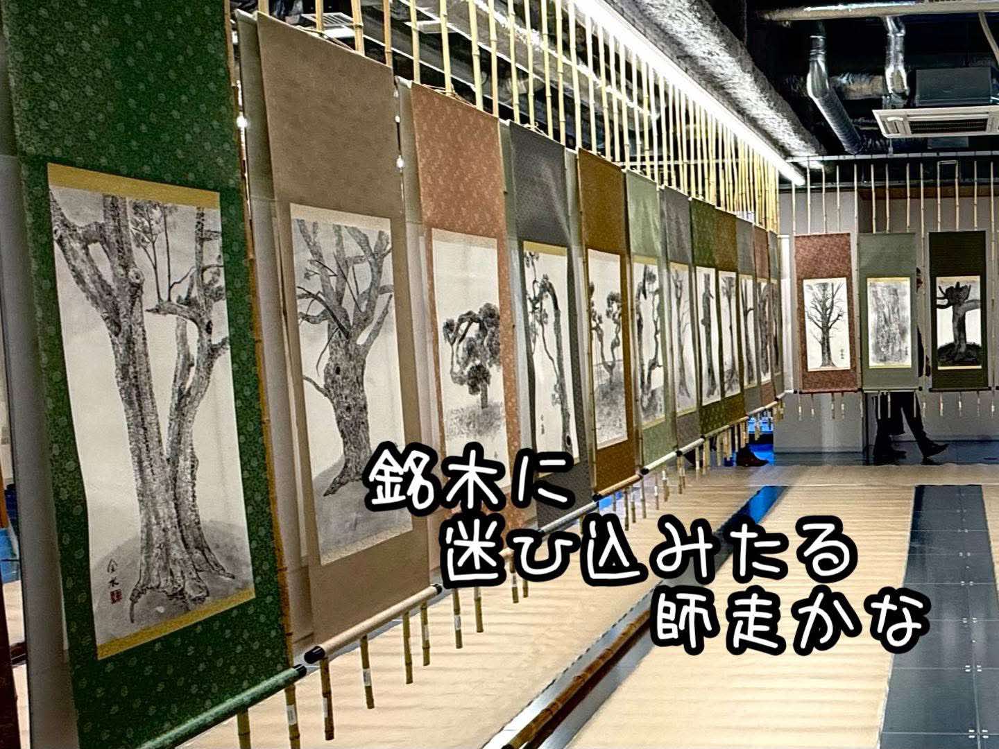 俳句フォトエッセイ2026.01.04銘木に迷ひ込みたる師走かな小山正見ぼくの感泣亭での最大のパートナー土井伸さんが忙しい。彼は書家でもあり、イベントプランナーでもある。土井さんはかつて八名川句会のメンバーだったが、個人的に話したことはなかった。その土井さんと再び会ったのは、僕が江東区を退職した年、つまり約4年前の4月だ。僕は地下鉄日比谷線に乗っていた。駅で言えば築地辺りである。Facebookに一つの投稿が現れた。「銀座の◯◯堂にいます。お近くの方、どうぞ」というような趣旨であった。発信者は土井さんだ。あと二駅で銀座だ。一瞬迷ったが、降りることにした。それが土井伸さんとの再会だった。今の感泣亭の諸活動があるのは、全て土井伸さんのお陰だが、それはさておき。土井さんが手掛けている展示がどんなものなのか、用事のついでに神田の美土代町まで出かけた。新しいビルの落成記念の展示会らしかった。会場の2階に登り、呆気に取られた。100坪はあろうかと思われるフロアーに竹林の如くに竹が林立し、掛軸が所狭しと並べられている。その数130本だという。壮観だ。掛軸に描かれているのは東京の銘木。全て水墨画だ。そう言えば、「江戸の樹木遺産百樹展」と入口にあった。作者は久保金司氏現在90歳。80歳を過ぎてから墨絵を始められたというから、これまたびっくりだ。東京中を足で巡り、江戸時代から続く樹木を探し出して描いたというからもう一度びっくり。卒寿にして矍鑠としている氏の若さにも憧れる。場所は都営地下鉄小川町の駅から徒歩3分。千代田区神田美土代町7-7、Parches KANDAの2階である。見て絶対に損をしない展覧会だ。会期は今月25日まで(土、日は休み)。それにしても土井伸さんは良い仕事をする!