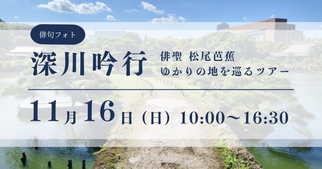 松尾芭蕉が『奥の細道』の旅に出発した深川。この歴史ある地を巡りながら、秋の深川の魅力を写真に撮り、俳句と組み合わせた「俳句フォト」を創作する吟行(散策しながら俳句を創作する活動)です。俳句フォトの会主宰・小山正見が丁寧に指導いたします。