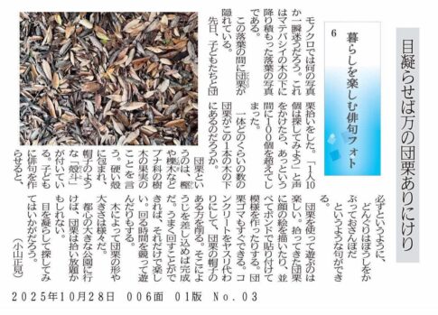俳句フォトエッセイモノクロでは何の写真か一瞬迷うだろう。これはマテバシイの木の下に降り積もった落葉の写真である。この落葉の間に団栗(どんぐり)が隠れている。先日子どもたちと団栗拾いをした。「1 人 10 個は探してみよう」と声を... -- 続きは公式ホームページへ! @haikuphotojp