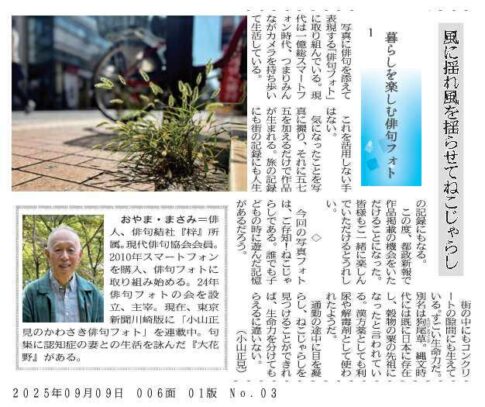 都政新報で俳句フォトの新連載が始まりました。毎週火曜日にアップ予定です。第一回は以下です。 写真に俳句を添えて表現する「俳句フォト」に取組んでいる。現代は一億総スマートフォン時代、つまりみんながカメラを持ち歩い... -- 続きは公式ホームページへ! @haikuphotojp