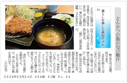 とんかつに味噌汁は付き物だ。具はさまざまだが、ぼくは蜆汁がいい。箸に当たる蜆の感触、コクのあるだしが何とも言えない。とんかつの脂っこさが途端に消える。 「蜆汁」は春の季語だ。 蜆と言えば、宍道湖、松江である。 ... -- 続きは公式ホームページへ! @haikuphotojp