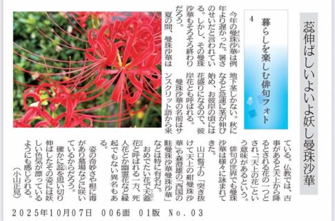 今年の曼珠沙華は例年より遅かった。暑さのせいだと言われている。しかし、その曼珠沙華もそろそろ終わりだろう。 夏の間、曼珠沙華は地下茎しかない。秋になると急速に茎が伸び始め、お彼岸の頃には花盛りになるので、彼岸花... -- 続きは公式ホームページへ! @haikuphotojp